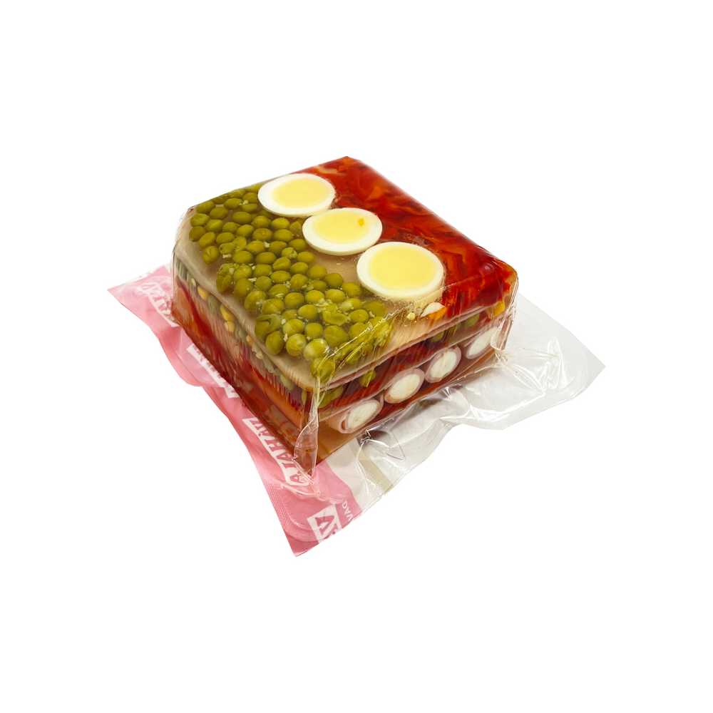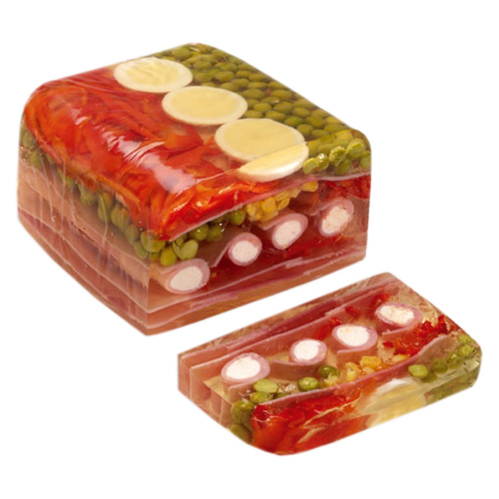 aszpik min. 50% (víz, sertés zselatin, cukor, asztali só, szukralóz édesítőszer, fűszerek, stabilizátorok: E 270, E 260, tartósítószerek: E 202), Pörkölt sonka min. 30% (standard minőség (sertéshús, sertéshéj, burgonyakeményítő, konyhasó, stabilizátor E250, E450, E451, sűrítőanyag E 407, E 412, természetes aroma, glükózszirup, antioxidáns E 301, aroma, fűszerkivonatok), uborka, paprika, fermentált alkoholecet, szacharin édesítőszer