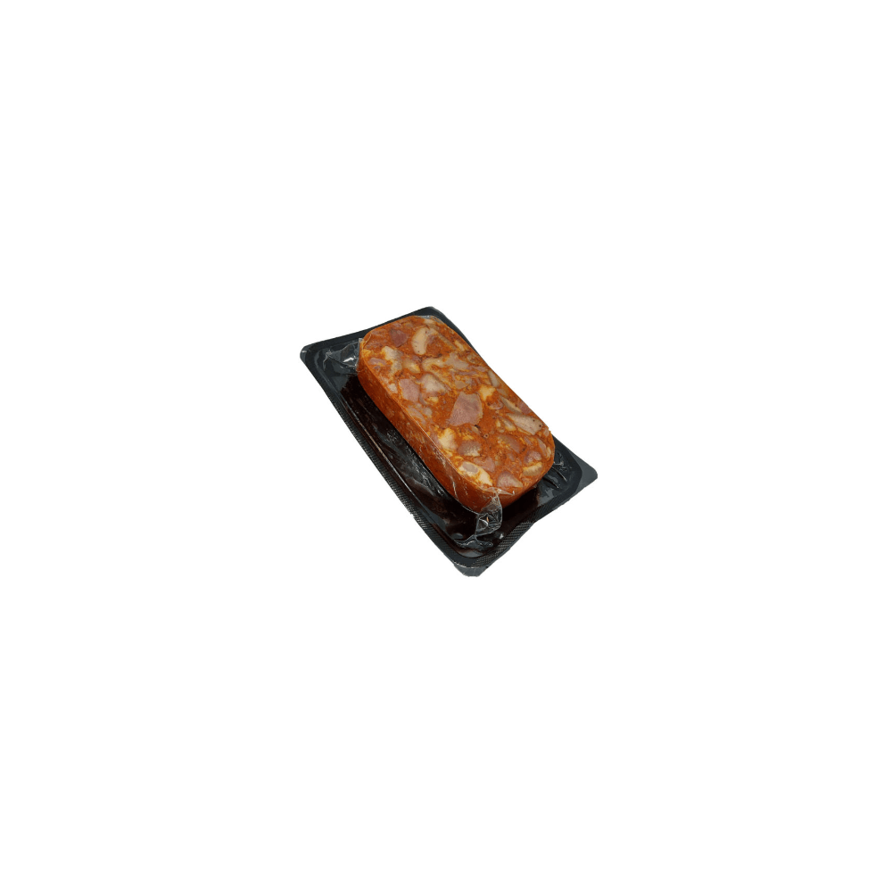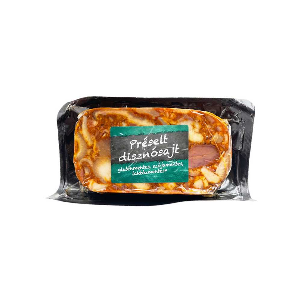 Bőrös sertés fejhús, sertés szív, sertés nyelv, sertés orr, víz, bőrke, étkezési só, fűszerpaprikák(1%), fokhagyma, fűszerek, fűszerkivonatok, színezék(kármin), étkezési zselatin(marha), füstaroma, tartósítószer(e250).