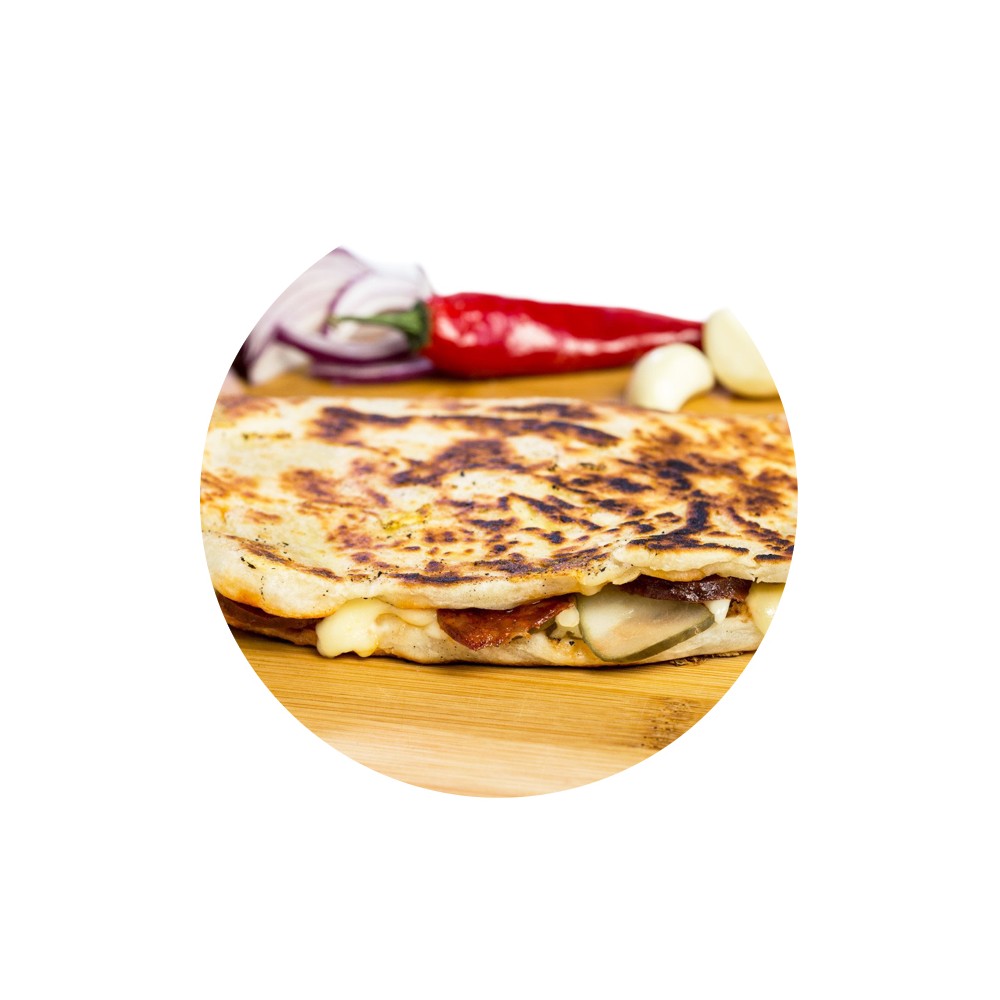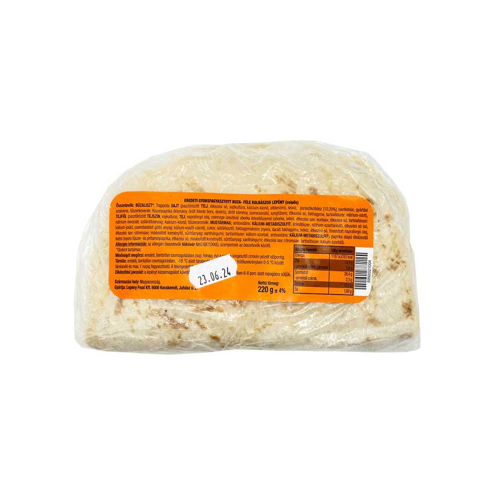 BÚZALISZT*, Trappista SAJT (pasztőrözött TEJ, étkezési só, sajtkultúra, kalcium-klorid, oltóenzim), ivóvíz, parasztkolbász [10,20%] (sertéshús, gyártási szalonna, fűszerkeverék: fűszerpaprika őrlemény, őrölt fekete bors, dextróz, őrölt kömény, szerecsendió, szegfűbors; étkezési só, fokhagyma, tartósítószer: nátrium-nitrit), TEJFÖL (pasztőrözött TEJSZÍN, vajkultúra), TEJ, napraforgó olaj, csemege ízesítésű uborka édesítőszerrel (uborka, ivóvíz, étkezési sav: ecetsav; étkezési só, tartósítószer: nátrium-benzoát; szilárdítóanyag: kalcium-klorid; fűszeraromák: MUSTÁRMAG; antioxidáns: KÁLIUM-METABISZULFIT, édesítőszer: nátrium-szacharinát), étkezési só (só, kálium-jodid, csomósodást gátló anyag: kálium-vas(II)-cianid), cukor, sütőélesztő, fokhagymakrém (nyers, darált fokhagyma, ivóvíz, étkezési só, finomított napraforgó olaj, étkezési sav: citromsav; módosított keményítő, sűrítőanyag: xanthángumi; tartósítószer: kálium-szorbát, antioxidáns: KÁLIUM-METABISZULFIT), paprika alapú ételízesítő krém (nyers fűszer- és pritaminpaprika, étkezési só, módosított keményítő, sűrítőanyag: xanthángumi; étkezési sav: citromsav; tartósítószer: kálium-szorbát).