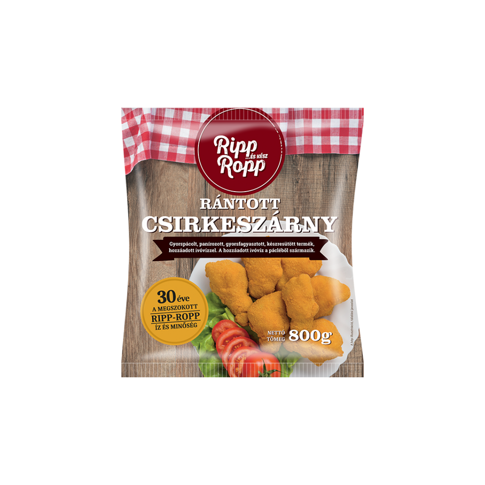 Pácolt csirkeszárny (62%) {csirkeszárny (54%), ivóvíz (5%), Ízesítő és adalékkeverék [glükózszirup, emulgeálószerek (trifoszfátok, polifoszfátok), sűrítőanyag (feldolgozott Euchema moszat), étkezési só, antioxidáns (nátrium-eritroaszkorbát), élesztőkivonat], étkezési só}, Panír {panírmorzsa [búzaliszt, étkezési só, élesztő, színezék (paprikakivonat)], ivóvíz, búzaliszt, étkezési só, paprikakeverék (fűszerpaprika, paprikakivonatok), fűszerkeverék (étkezési só, dextróz, fűszerkivonatok), fokhagymapor}, Napraforgó étolaj.