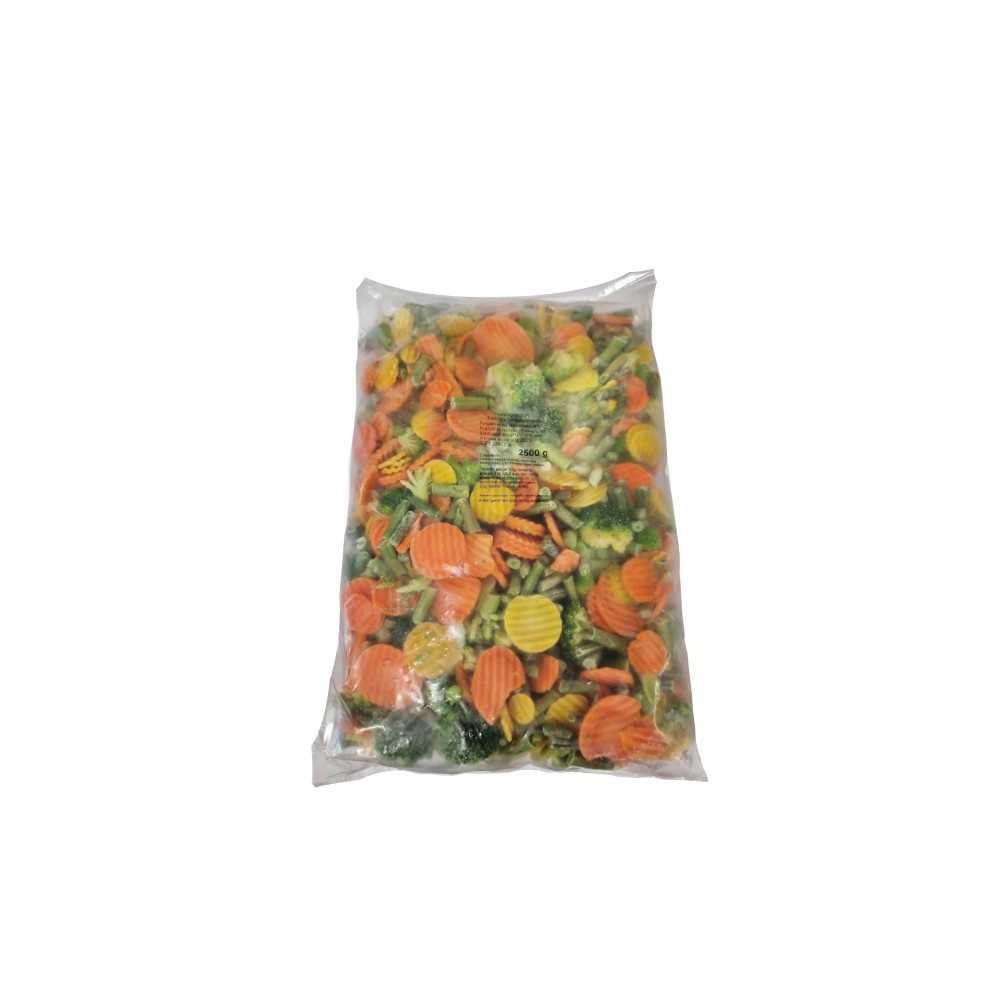 Sárga sárgarépa korong, hullámos sárgarépa korong, romano bab, vágott brokkoli rózsa termékek felhasználásával készült zöldség keverék.